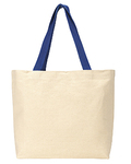 9 oz. natural mid-weight cotton canvas; 21" reinforced webbed handles; CPSIA compliant; 10"w x 7 ½"h approx. front and back imprint areas; 5 ½" diameter max. front and back embroidery areas;