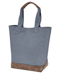 100% cotton canvas; Polyurethane leather base and handle grip; Matte nickle rivets; Magnet closure; Cotton sheeting lining with interior zipper pocket; 11.5"W x 15"H x 6.75"D;